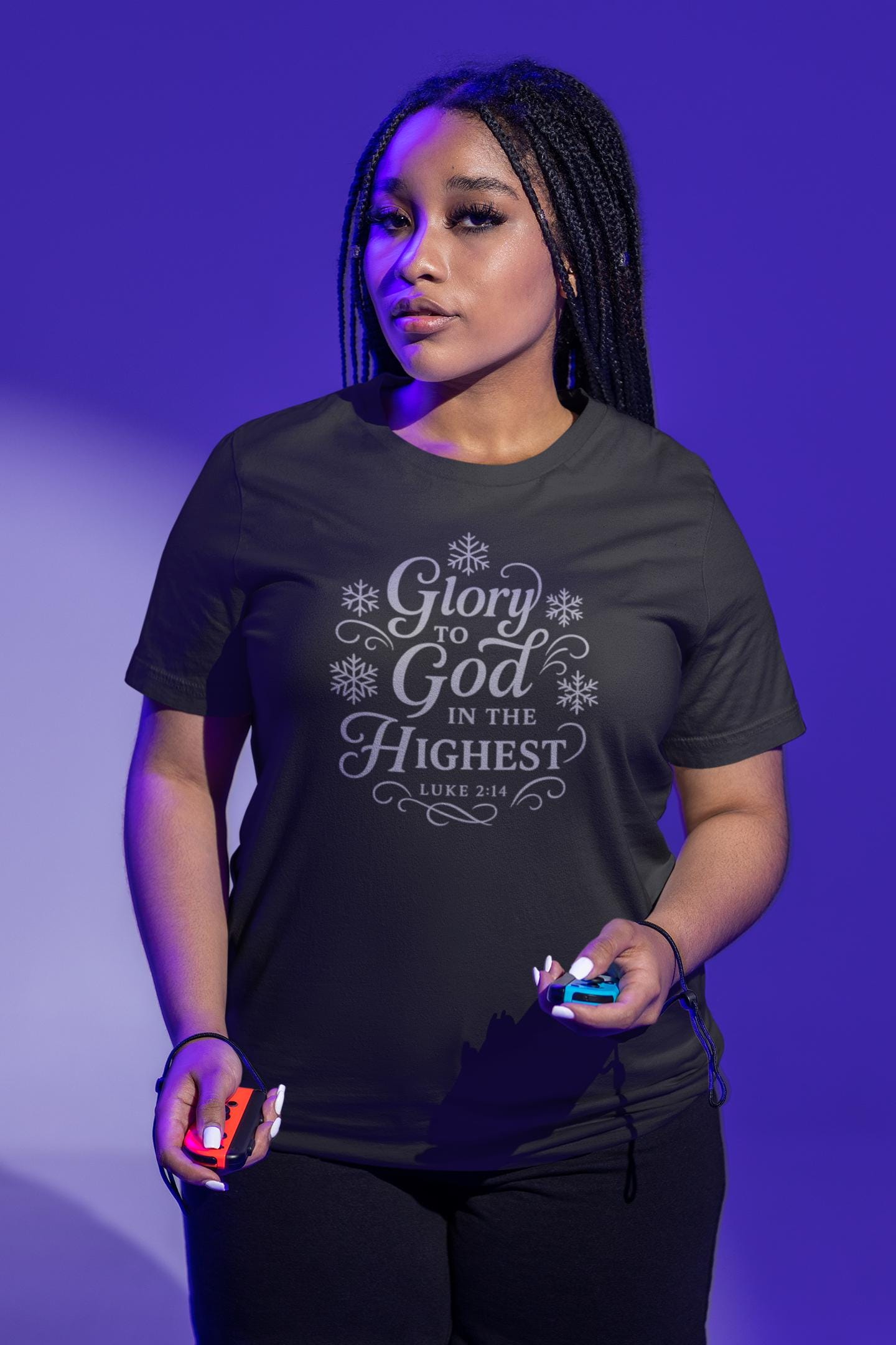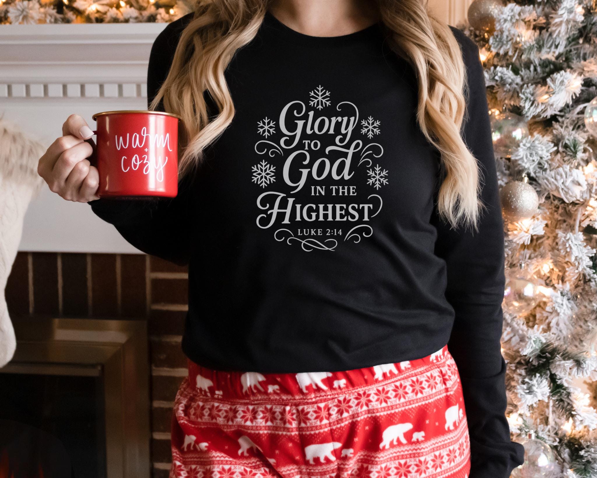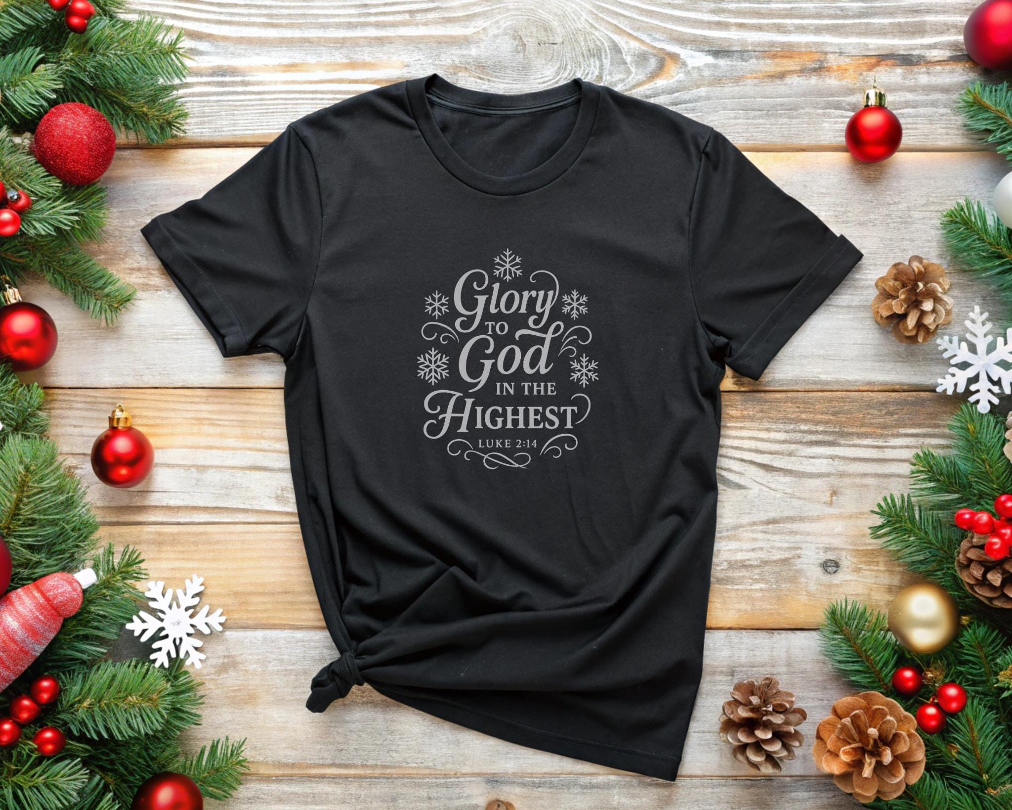 Celebrate the true meaning of Christmas with this Glory to God in the Highest shirt, inspired by Luke 2:14. Designed with a soft, minimal style featuring delicate snowflakes and swirly accents, this shirt is perfect for women who want to share their faith during the holiday season.