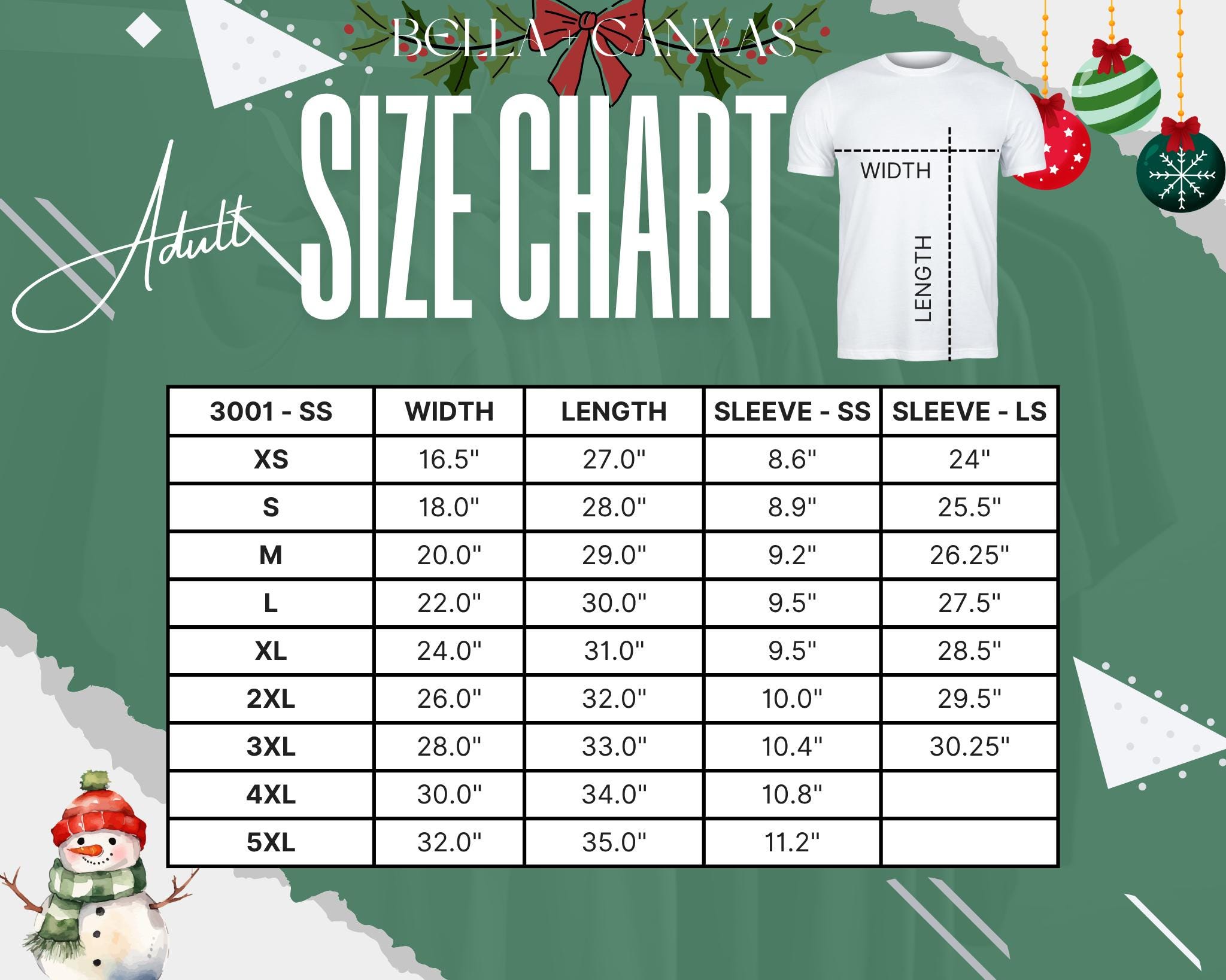 Made with high quality, super soft Bella Canvas fabric, this design is available in several flattering options: the classic unisex 3001 short sleeve, the 3501 long sleeve for added coverage, the 3005 v-neck, the 8882 cropped tee for a modern fit, and the 7502 cropped sweatshirt for cozy layering. Warm Gildan sweatshirt and hoodie styles are also available, making it easy to find the right fit for your holiday wardrobe.